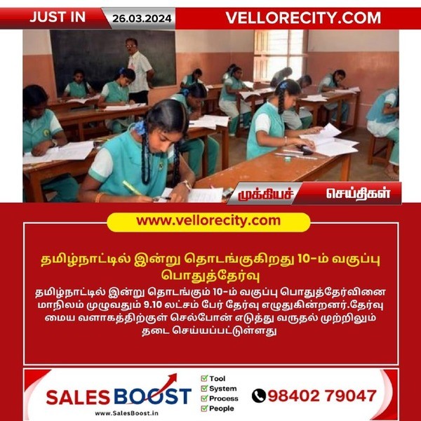 தமிழ்நாட்டில் இன்று தொடங்கும் 10-ம் வகுப்பு பொதுத்தேர்வினை மாநிலம் முழுவதும் 9.10 லட்சம் பேர் தேர்வு எழுதுகின்றனர். தேர்வு மைய வளாகத்திற்குள் செல்போன் எடுத்து வருதல் முற்றிலும் தடை செய்யப்பட்டுள்ளது.