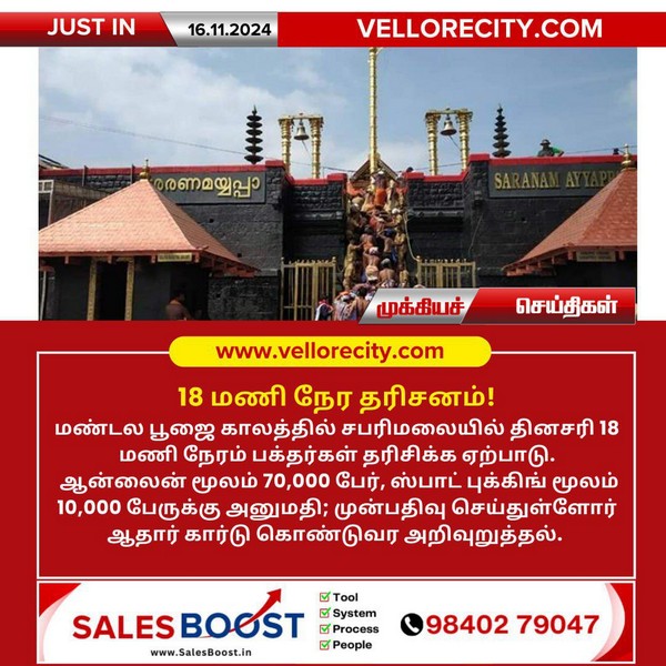 சபரிமலை ஐயப்பன் கோவிலில் மண்டல பூஜை காலத்தில் சபரிமலையில் தினசரி 18 மணி நேரம் பக்தர்கள் தரிசிக்க ஏற்பாடு செய்யப்பட்டுள்ளது. ஆன்லைன் மூலம் 70,000 பேர், ஸ்பாட் புக்கிங் மூலம் 10,000 பேருக்கு அனுமதி முன்பதிவு செய்துள்ளோர் ஆதார் கார்டு கொண்டுவர அறிவுறுத்தல்.