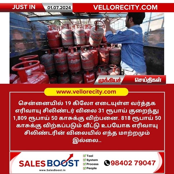 சென்னையில் 19 கிலோ எடையுள்ள வர்த்தக எரிவாயு சிலிண்டர் விலை 31 ரூபாய் குறைந்து 1,809 ரூபாய் 50 காசுக்கு விற்பனை. 818 ரூபாய் 50 காசுக்கு விற்கப்படும் வீட்டு உபயோக எரிவாயு சிலிண்டரின் விலையில் எந்த மாற்றமும் இல்லை.