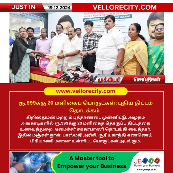 கிறிஸ்துமஸ் மற்றும் புத்தாண்டை முன்னிட்டு, அமுதம் அங்காடிகளில் ரூ.999க்கு 20 மளிகைத் தொகுப்பு திட்டத்தை உணவுத்துறை அமைச்சர் சக்கரபாணி தொடங்கி வைத்தார். இதில் மஞ்சள் தூள், பாஸ்மதி அரிசி, சூரியகாந்தி எண்ணெய், பிரியாணி மசாலா உள்ளிட்ட பொருட்கள் அடங்கும்.