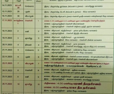 திருவண்ணாமலை அருணாசலேஸ்வரர் திருக்கோவிலில், கார்த்திகை மாதம் 01ம் தேதி (17.11.2023) வெள்ளிக்கிழமை அன்று கொடியேற்றத்துடன் தீபத் திருவிழா தொடங்குகிறது. கார்த்திகை 10ம் தேதி…