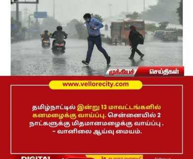 தமிழ்நாட்டில் இன்று 13 மாவட்டங்களில் கனமழைக்கு வாய்ப்பு. சென்னையில் 2 நாட்களுக்கு மிதமானமழைக்கு வாய்ப்பு என வானிலை ஆய்வு மையம்…