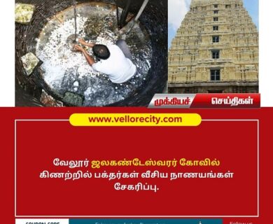 வேலூரில் அமைந்துள்ள ஜலகண்டேஸ்வரர் திருக்கோவிலில் பக்தர்கள் வேண்டுதலுக்காக கிணற்றில் வீசிய நாணயங்கள் சேகரிப்பு செய்கின்றனர்.