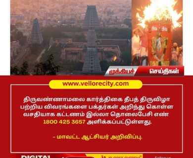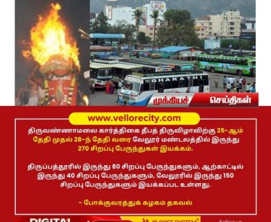 திருவண்ணாமலை திருக்கார்த்திகை தீபத் திருவிழாவிற்கு 25-ஆம் தேதி முதல் 28-ந் தேதி வரை வேலூர் மண்டலத்தில் இருந்து 270…