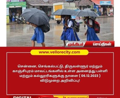 மிக்ஜாம் புயல் பாதிப்பு காரணமாக சென்னை, காஞ்சிபுரம், திருவள்ளூர், செங்கல்பட்டு ஆகிய மாவட்டங்களில் உள்ள அனைத்து பள்ளி, கல்லூரிகளுக்கு நாளை (06.12.23) விடுமுறை…