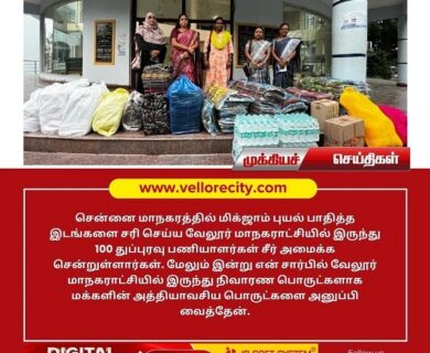 சென்னை மாநகரத்தில் மிக்ஜாம் புயல் பாதித்த இடங்களை சரி செய்ய வேலூர் மாநகராட்சியில் இருந்து 100 துப்புரவு பணியாளர்கள் சீர்…