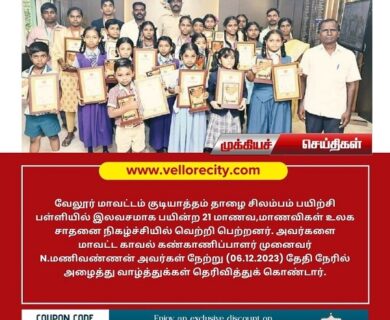 வேலூர் மாவட்டம் குடியாத்தம் தாழை சிலம்பம் பயிற்சி பள்ளியில் இலவசமாக பயின்ற 21 மாணவ, மாணவிகள் உலக சாதனை நிகழ்ச்சியில்…
