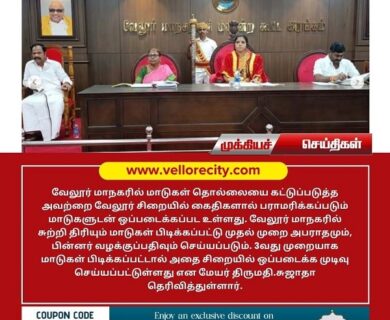 வேலூர் மாநகரில் சுற்றி திரியும் மாடுகளை வேலூர் சிறை கைதிகளால் பராமரிக்கப்படும் என மேயர் அறிவிப்பு!