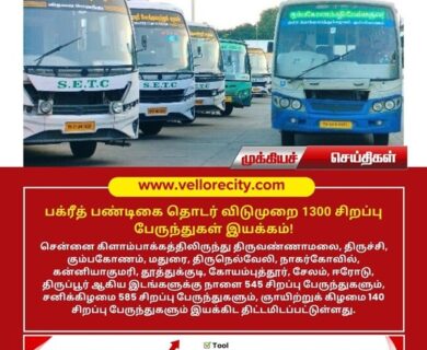 பக்ரீத் பண்டிகை தொடர் விடுமுறை 1300 சிறப்பு பேருந்துகள் இயக்கம்! சென்னை கிளாம்பாக்கத்திலிருந்து திருவண்ணாமலை, திருச்சி, கும்பகோணம், மதுரை, திருநெல்வேலி,…