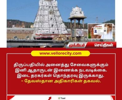திருப்பதியில் அனைத்து சேவைகளுக்கும் இனி ஆதாருடன் இணைக்க நடவடிக்கை. இடை தரகர்கள் தொந்தரவு இருக்காது. என தேவஸ்தான அதிகாரிகள் தகவல்…