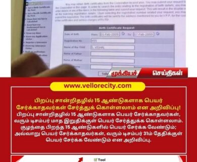 பிறப்பு சான்றிதழில் 15 ஆண்டுகளாக பெயர் சேர்க்காதவர்கள், வரும் டிசம்பர் மாத இறுதிக்குள் பெயர் சேர்த்துக்க கொள்ளலாம். குழந்தை பிறந்த…