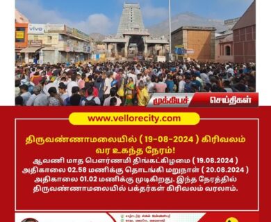 திருவண்ணாமலையில் ஆவணி மாதப் பெளா்ணமி கிரிவலம் (ஆகஸ்ட் – 19) அதிகாலை 02:58 மணிக்கு தொடங்கி செவ்வாய்க்கிழமை (ஆகஸ்ட் – 20) அதிகாலை 01:02 மணிக்கு முடிகிறது. இந்த நேரத்தில் பக்தா்கள் கிரிவலம்…