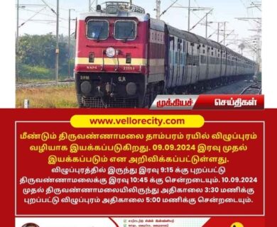 மீண்டும் திருவண்ணாமலை தாம்பரம் ரயில் விழுப்புரம் வழியாக இயக்கப்படுகிறது. 09.09.2024 இரவு முதல் இயக்கப்படும் என அறிவிக்கப்பட்டுள்ளது. விழுப்புரத்தில் இருந்து…