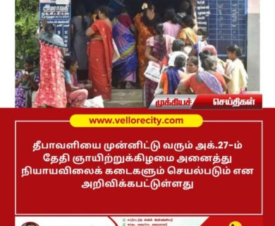 தீபாவளியை முன்னிட்டு வரும் அக்.27-ம் தேதி ஞாயிற்றுக்கிழமை அனைத்து நியாயவிலைக் கடைகளும் செயல்படும் என அறிவிக்கபட்டுள்ளது.