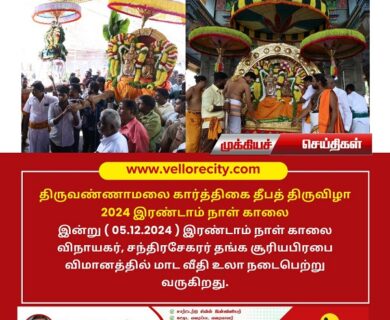 திருவண்ணாமலை அருள்மிகு அருணாசலேஸ்வரர் திருக்கோவில் திருக்கார்த்திகை தீபத் திருவிழா முதல் நாளான நேற்று (04.12.2024) விநாயகர்- மூஷிக வாகனத்திலும், சுப்பிரமணியர்- மயில் வாகனத்திலும்,…