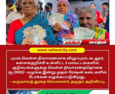 புயல் வெள்ள நிவாரணமாக விழுப்புரம், கடலூர், கள்ளக்குறிச்சி உள்ளிட்ட 3 மாவட்டங்களில் குடும்பங்களுக்கு வெள்ள நிவாரணத்தொகை ரூ.2000/- வழங்க இன்று…