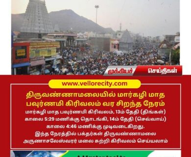 திருவண்ணாமலையில் மார்கழி மாதப் பெளா்ணமி கிரிவலம் (ஜனவரி – 13) திங்கட்கிழமை காலை 5.29 மணிக்கு தொடங்கி செவ்வாய்கிழமை (ஜனவரி – 14) காலை 04:46…