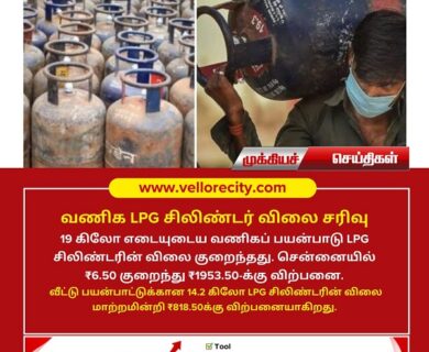 19 கிலோ எடையுடைய வணிகப் பயன்பாடு LPG சிலிண்டரின் விலை குறைந்தது. சென்னையில் 76.50 குறைந்து ₹ 1953.50-க்கு விற்பனை.…