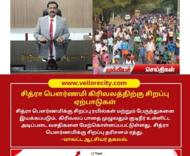 சித்ரா பௌர்ணமிக்கு சிறப்பு ரயில்கள் மற்றும் பேருந்துகளை இயக்கப்படும். கிரிவலப் பாதை முழுவதும் குடிநீர் உள்ளிட்ட அடிப்படை வசதிகளை மேற்கொள்ளப்பபட்டுள்ளது.…