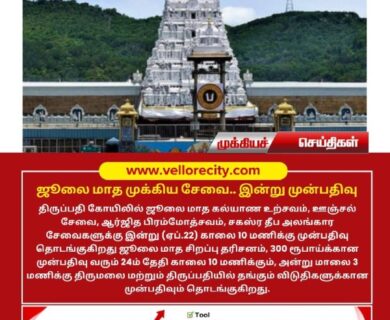 திருப்பதி கோயிலில் ஜூலை மாத கல்யாண உற்சவம், ஊஞ்சல் சேவை, ஆர்ஜித பிரம்மோத்சவம், சகஸ்ர தீப அலங்கார சேவைகளுக்கு இன்று…