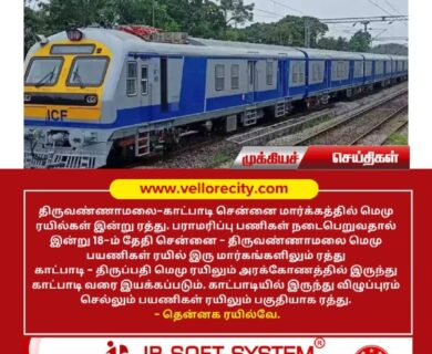 திருவண்ணாமலை-காட்பாடி மார்க்கத்தில் செல்லும் ரயில்கள் பராமரிப்பு காரணமாக இன்று 18-ம் தேதி சென்னை – திருவண்ணாமலை மெமு பயணிகள் ரயில்…