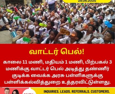 காலை 11 மணி, மதியம் 1 மணி, பிற்பகல் 3 மணிக்கு வாட்டர் பெல் அடித்து தண்ணீர் குடிக்க வைக்க…