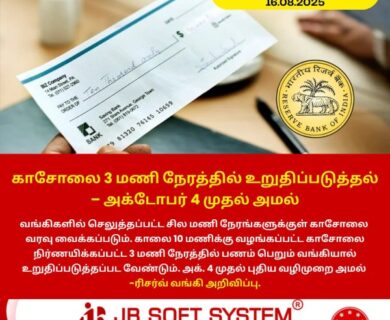 வங்கிகளில் செலுத்தப்பட்ட சில மணி நேரங்களுக்குள் காசோலை வரவு வைக்கப்படும். காலை 10 மணிக்கு வழங்கப்பட்ட காசோலை நிர்ணயிக்கப்பட்ட 3 மணி நேரத்தில் பணம் பெறும் வங்கியால் உறுதிப்படுத்தப்பட வேண்டும். அக்.…