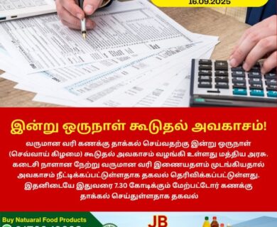 வருமான வரி கணக்கு தாக்கல் செய்வதற்கு இன்று ஒருநாள் (செவ்வாய் கிழமை) கூடுதல் அவகாசம் வழங்கி உள்ளது மத்திய அரசு. கடைசி நாளான நேற்று…