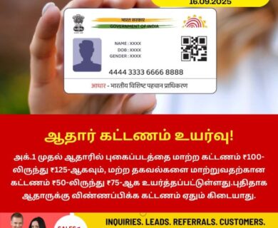 அக்டோபர்-01 முதல் ஆதாரில் புகைப்படத்தை மாற்ற கட்டணம் ரூ.100- லிருந்து ரூ.125-ஆகவும், மற்ற தகவல்களை மாற்றுவதற்கான கட்டணம் ரூ.50-லிருந்து ரூ.75-ஆக…