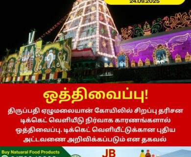 திருப்பதி ஏழுமலையான் கோயிலில் சிறப்பு தரிசன டிக்கெட் வெளியீடு நிர்வாக காரணங்களால் ஒத்திவைப்பு. டிக்கெட் வெளியீட்டுக்கான புதிய அட்டவணை அறிவிக்கப்படும்…