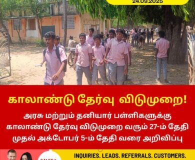 அரசு மற்றும் தனியார் பள்ளிகளுக்கு காலாண்டு தேர்வு விடுமுறை வரும் 27-ம் தேதி முதல் அக்டோபர் 5-ம் தேதி வரை…