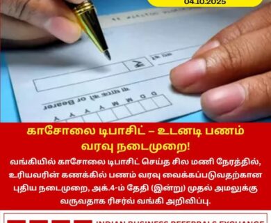 வங்கியில் காசோலை டிபாசிட் செய்த சில மணி நேரத்தில், உரியவரின் கணக்கில் பணம் வரவு வைக்கப்படுவதற்கான புதிய நடைமுறை, அக்டோபர்…