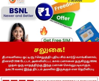 தீபாவளியை ஒட்டி ரூ.1 செலுத்தி புதிய சிம் கார்டு வாங்கினால், தினசரி 2GB டேட்டா, அன்லிமிட்டட் கால் ப்ளானை தருகிறது…