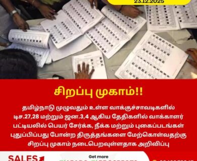 தமிழ்நாடு முழுவதும் உள்ள வாக்குச்சாவடிகளில் டிச.27,28 மற்றும் ஜன.3,4 ஆகிய தேதிகளில் வாக்காளர் பட்டியலில் பெயர் சேர்க்க, நீக்க மற்றும் புகைப்படங்கள் புதுப்பிப்பது போன்ற திருத்தங்களை…
