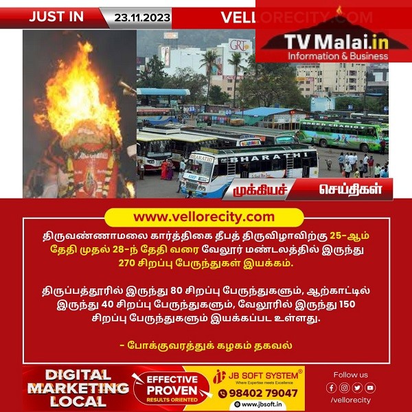 திருவண்ணாமலை திருக்கார்த்திகை தீபத் திருவிழாவிற்கு 25-ஆம் தேதி முதல் 28-ந் தேதி வரை வேலூர் மண்டலத்தில் இருந்து 270 சிறப்பு பேருந்துகள் இயக்கம்.
