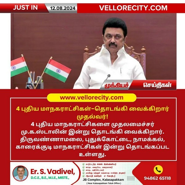 4 புதிய மாநகராட்சிகளை முதலமைச்சர் மு.க.ஸ்டாலின் இன்று தொடங்கி வைக்கிறார். திருவண்ணாமலை, புதுக்கோட்டை, நாமக்கல், காரைக்குடி மாநகராட்சிகள் இன்று தொடங்கப்பட உள்ளது. 471