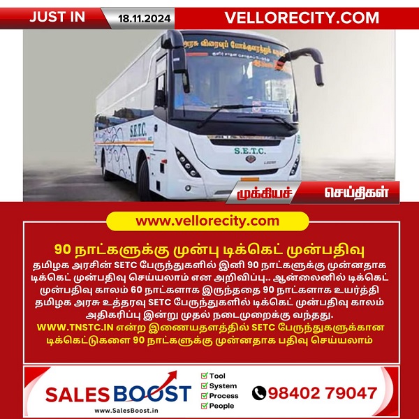 தமிழக அரசின் SETC பேருந்துகளில் இனி 90 நாட்களுக்கு முன்னதாக டிக்கெட் முன்பதிவு செய்யலாம் என அறிவித்துள்ளது. ஆன்லைனில் டிக்கெட் முன்பதிவு காலம் 60 நாட்களாக இருந்ததை 90 நாட்களாக உயர்த்தி தமிழக அரசு உத்தரவு SETC பேருந்துகளில் டிக்கெட் முன்பதிவு காலம் அதிகரிப்பு இன்று முதல் நடைமுறைக்கு வந்தது. WWW.TNSTC.IN என்ற இணையதளத்தில் SETC பேருந்துகளுக்கான டிக்கெட்டுகளை 90 நாட்களுக்கு முன்னதாக பதிவு செய்யலாம்.