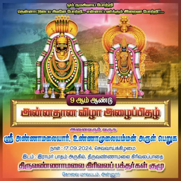 ஸ்ரீ அண்ணாமலையார், உண்ணாமுலையம்மன் அருளால்: நாள்: 17.09.2024, செவ்வாய்க்கிழமை இடம்: இராமர் பாதம் அருகில், திருவண்ணாமலை கிரிவலப்பாதை இப்படிக்கு: திருவண்ணாமலை கிரிவல பக்தர்கள் குழு, அன்னூர், கோவை மாவட்டம். 655