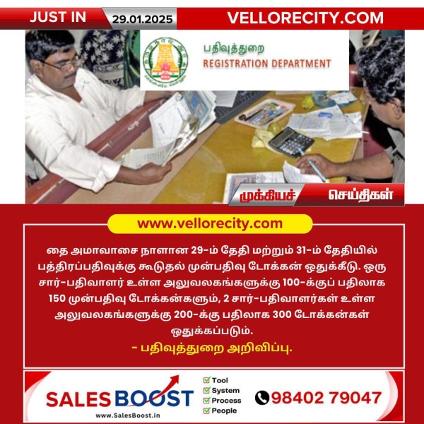 ஒரு சார்-பதிவாளர் உள்ள அலுவலகங்களுக்கு 100-க்குப் பதிலாக 150 முன்பதிவு டோக்கன்களும், 2 சார்- பதிவாளர்கள் உள்ள அலுவலகங்களுக்கு 200-க்கு பதிலாக 300 டோக்கன்கள் ஒதுக்கப்படும். – பதிவுத்துறை அறிவிப்பு.