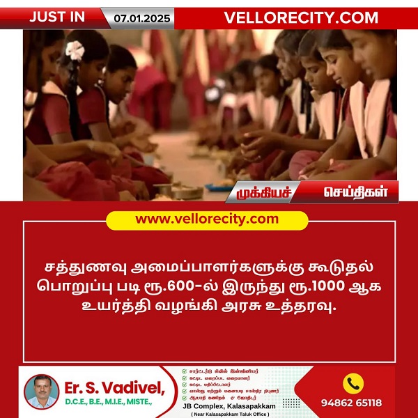 தமிழக அரசின் புதிய உத்தரவின் படி, சத்துணவு அமைப்பாளர்களுக்கு வழங்கப்படும் கூடுதல் பொறுப்பு படி தொகை ரூ.600-ல் இருந்து ரூ.1000 ஆக உயர்த்தப்பட்டுள்ளது. 416