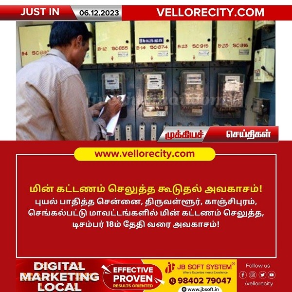 புயல் பாதித்த சென்னை, திருவள்ளூர், காஞ்சிபுரம், செங்கல்பட்டு மாவட்டங்களில் மின் கட்டணம் செலுத்த, டிசம்பர் 18ம் தேதி வரை அவகாசம் அளிக்கப்பட்டுள்ளது. 805