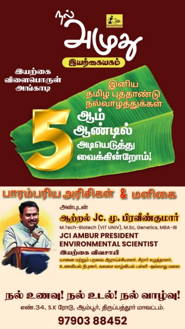 திருப்பத்தூர் மாவட்டம் ஆம்பூர் பகுதியில் இயற்கை விவசாயத்தில் பெருமை கொண்ட ஆற்றல் Jc. மு. பிரவீண்குமார் அவர்களின் தலைமையில் இயற்கை விளைபொருள் அங்காடி “அமுது”, தனது 5வது ஆண்டு பயணத்தை இனிய தமிழ் புத்தாண்டு தினத்தில் வெகு சிறப்பாகக் கொண்டாடியுள்ளது!