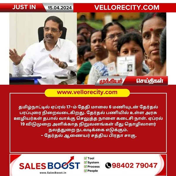 தமிழ்நாட்டில் ஏப்ரல் 17-ம் தேதி மாலை 6 மணியுடன் தேர்தல் பரப்புரை நிறைவடைகிறது. தேர்தல் பணியில் உள்ள அரசு ஊழியர்கள் தபால் வாக்கு செலுத்த நாளை கடைசி நாள். ஏப்ரல் 19 விடுமுறை அளிக்காத நிறுவனங்கள் மீது தொழிலாளர் நலத்துறை நடவடிக்கை எடுக்க தேர்தல் ஆணையர் சத்திய பிரதா சாகு அறிவித்துள்ளார்.