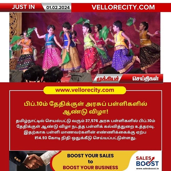 தமிழ்நாட்டில் செயல்பட்டு வரும் 37,576 அரசு பள்ளிகளில் பிப்.10ம் தேதிக்குள் ஆண்டு விழா நடத்த பள்ளிக் கல்வித்துறை உத்தரவு. இதற்காக பள்ளி மாணவர்களின் எண்ணிக்கைக்கு ஏற்ப ₹14.93 கோடி நிதி ஒதுக்கீடு செய்யப்பட்டுள்ளது.