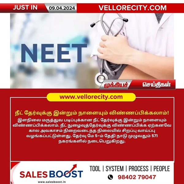 இளநிலை மருத்துவ படிப்புக்கான நீட் தேர்வுக்கு இன்றும் நாளையும் விண்ணப்பிக்கலாம். நீட் நுழைவுத்தேர்வுக்கு விண்ணப்பிக்க ஏற்கனவே கால அவகாசம் நிறைவடைந்த நிலையில் சிறப்பு வாய்ப்பு வழங்கப்பட்டுள்ளது. தேர்வு மே 5-ம் தேதி நாடு முழுவதும் 571 நகரங்களில் நடைபெறுகிறது.