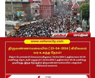 திருவண்ணாமலையில் சித்திரை மாதப் பெளா்ணமி கிரிவலம் செவ்வாய்கிழமை (ஏப்ரல் – 23) அதிகாலை 03:25 மணிக்கு தொடங்கி புதன்கிழமை (ஏப்ரல்…