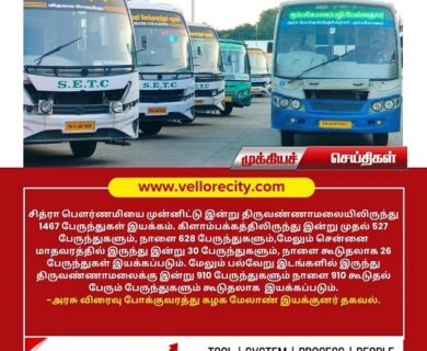 சித்ரா பௌர்ணமியை முன்னிட்டு இன்று திருவண்ணாமலையிலிருந்து 1467 பேருந்துகள் இயக்கம். கிளாம்பக்கத்திலிருந்து இன்று முதல் 527 பேருந்துகளும், நாளை 628…