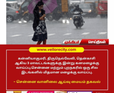 கன்னியாகுமரி,திருநெல்வேலி,தென்காசி ஆகிய மூன்று மாவட்டங்களில் இன்று கன மழை பெய்ய வாய்ப்பு. சென்னை மற்றும் புற நகரங்களில் ஒரு சில…