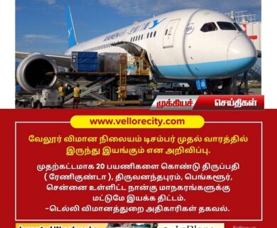 வேலூர் விமான நிலையம் டிசம்பர் முதல் வாரத்தில் இருந்து இயங்கும் எனவும், முதற்கட்டமாக 20 பயணிகளை கொண்டு திருப்பதி(ரேணிகுண்டா),…