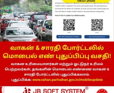 வாகன உரிமையாளர்கள் மற்றும் ஓட்டுநர் உரிமம் பெற்றவர்கள், தங்களின் மொபைல் எண்ணை வாகன் & சாரதி போர்ட்டலில் புதுப்பிக்கலாம். புதுப்பிக்க: www.vahan.parivahan.gov.in/mobileupdate